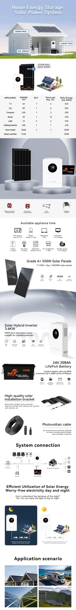 The 3.6KW hybrid solar inverter with 24V 208Ah LiFePO4 battery is designed as a compact and integrated solar energy storage system. It combines power conversion, battery storage and intelligent monitoring into a unified architecture suitable for residential and small commercial installations.