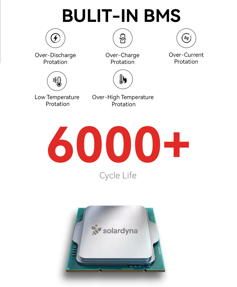 The integrated Battery Management System (BMS) provides real-time monitoring of voltage, current, temperature, and cell balancing. Multiple protection mechanisms ensure safe operation under various working conditions.