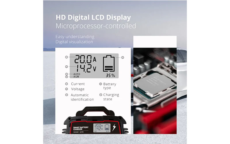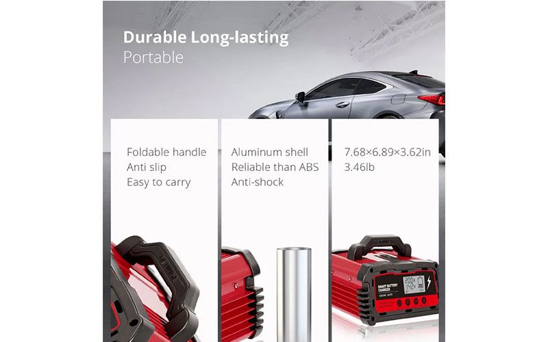 DC100A/200A/250A car battery charger is suitable for 12V/24V GEL and AGM batteries, and cannot charge lithium batteries. Can automatically recognize battery voltage, PWM pulse modulation four stage charging; It has reverse connection, short circuit, and overcharge protection, and the intelligent temperature control fan automatically starts when the body temperature exceeds 113 ° F. It also includes a repair mode that can handle severely depleted batteries with voltages below 8V, but if the battery is completely damaged, it cannot be repaired.