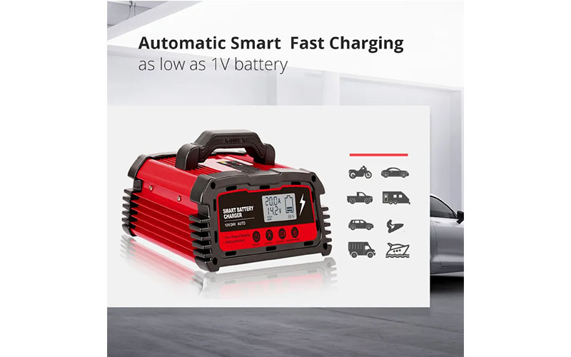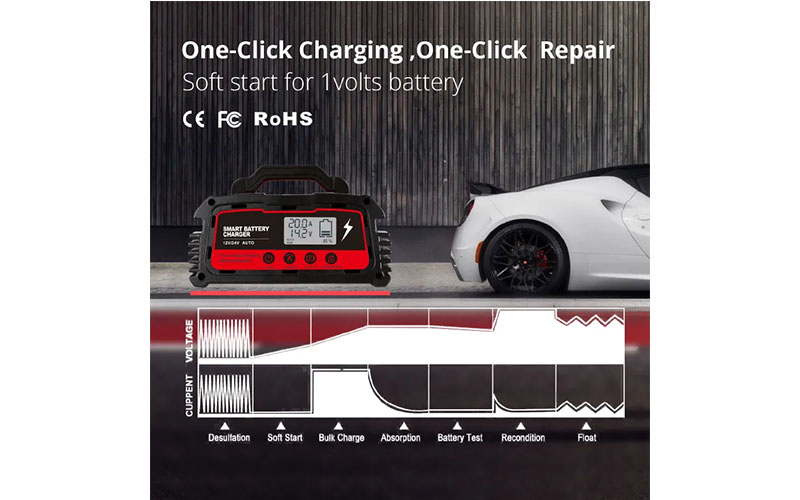 DC100A/200A/250A car battery charger is suitable for 12V/24V GEL and AGM batteries, and cannot charge lithium batteries. Can automatically recognize battery voltage, PWM pulse modulation four stage charging; It has reverse connection, short circuit, and overcharge protection, and the intelligent temperature control fan automatically starts when the body temperature exceeds 113 ° F. It also includes a repair mode that can handle severely depleted batteries with voltages below 8V, but if the battery is completely damaged, it cannot be repaired.